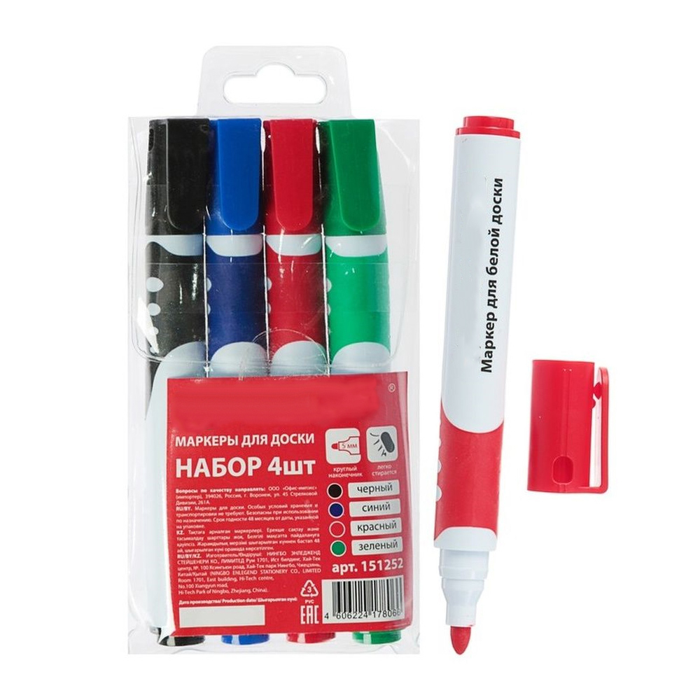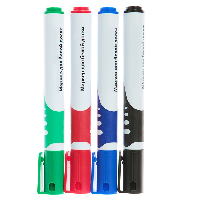 Высококачественный набор маркеров для белой доски. Предназначен для письма на досках с магнитно-маркерной поверхностью. 4 цвета в наборе: черный, красный, синий, зеленый. Круглый пластиковый корпус имеет диаметр 17 мм. Корпус оснащен удобной прорезиненной зоной захвата, для более удобного использования. Наконечник круглой формы обеспечивает толщину линии письма 5 мм, что позволяет писать крупным шрифтом, который будет хорошо виден. Основа чернил - спиртовая. Чернила быстро высыхают и не оставляют разводов, легко стираются сухой губкой. Изделие не перезаправляется. Цвет колпачка и прорезиненной вставки соответствует цвету чернил.