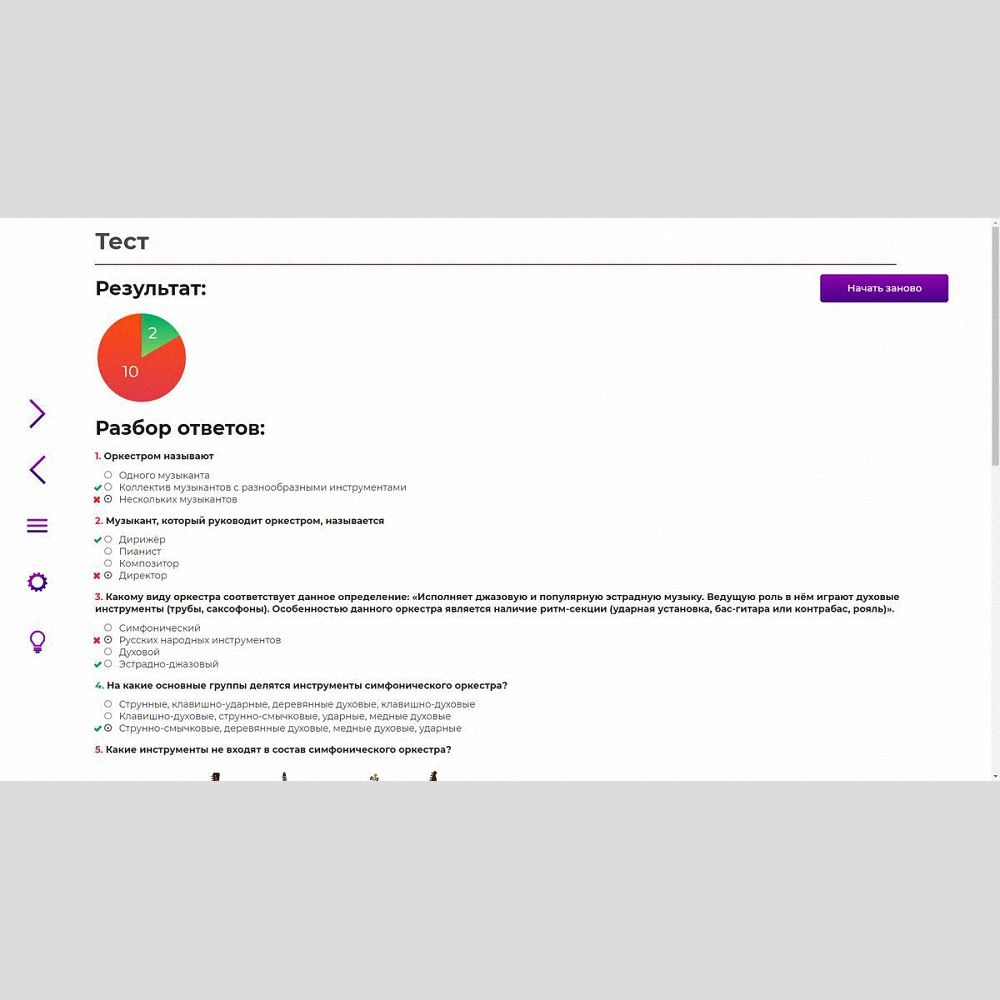 В приложении предлагается расширить предусмотренное примерной программой изучение инструментов симфонического оркестра. Обучающиеся знакомятся с определением «оркестр» через его сопоставление с понятиями «солист» и «ансамбль», изучают разновидности оркестров (симфонический, оркестр русских народных инструментов, духовой и эстрадно-джазовый), могут увидеть и прослушать составляющие их инструменты. Предлагаются кроссворд, викторины, тест на закрепление изученного материала.
