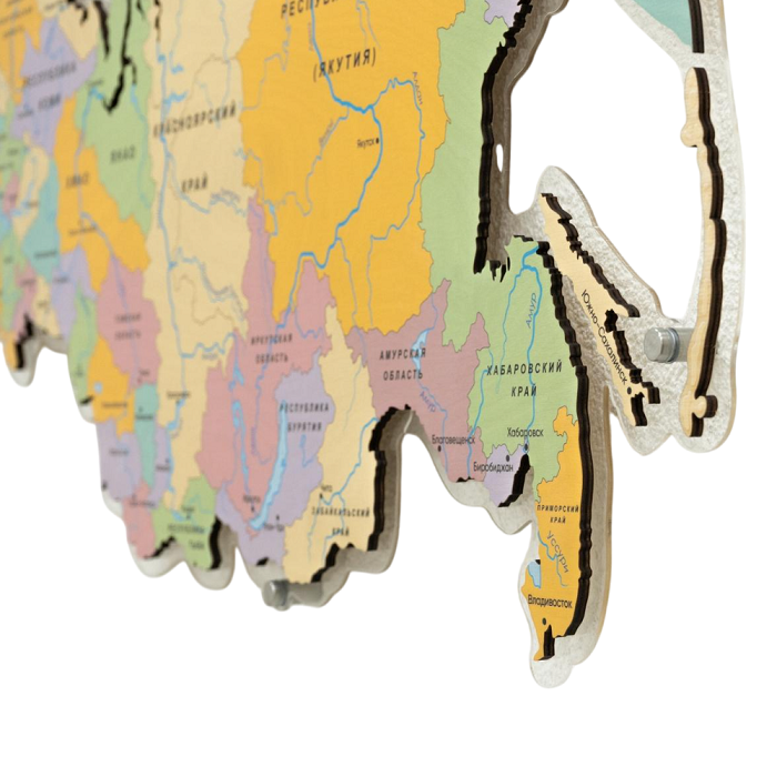 Настенная панель состоит из основы – прозрачного акрилового пластика, на которую крепится карта из экологичной берёзовой фанеры. Сверху идёт UF-печать стойкими к выцветанию красками, которая обеспечивает яркость и чёткость изображений на протяжении длительного времени.