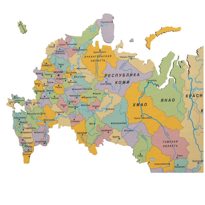 Административно-территориальную карту России можно приобрести и установить на стены – не требуется никаких капитальных ремонтов. Это одновременно эффективный учебный инструмент и декоративное панно, которое украсит образовательное пространство школ и детских садов.