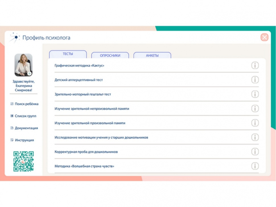 Тесты: Графическая методика «Кактус», Детский апперцептивный тест, Зрительно-моторный гештальт-тест Лоретты Бендер, «Изучение зрительной непроизвольной памяти», «Изучение зрительной произвольной памяти», «Корректурная проба для дошкольников», Методика «Волшебная страна чувств», Методика «Домик», Методика «Запоминание 10 слов», Методика «Запомни и расставь точки», Методика «Отгадывание загадок», Методика диагностики детских страхов и еще более 50 тестов.