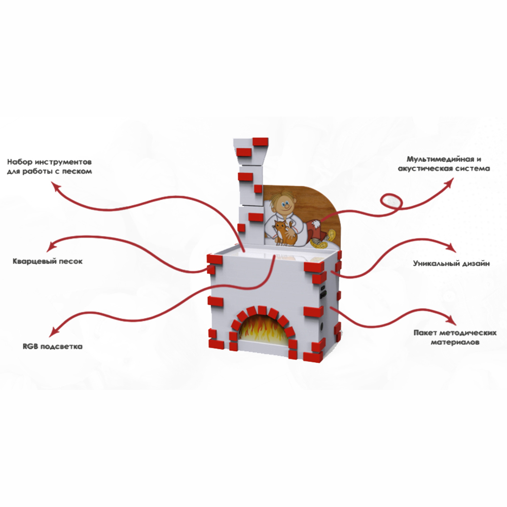 Стол сделан из ламинированной ДСП с несколькими цветами на выбор. Используется акриловое стекло, которое безопасно для ребенка. В комплект входит песок 4 кг, подсветка RGB и пульт управления.