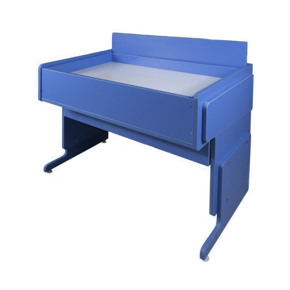 Многофункциональный тактильный комплекс-парта, представляет собой комбинированное рабочее место дошкольника или ребенка младшего школьного возраста. Отличительной особенностью данного комплекса является его полифункциональность: сняв столешницу можно работать с двумя видами песка (кинетическим и кварцевым), вернув столешницу на место, комплекс становится полноценным рабочим местом – партой. Работа с песком ведется на антивандальной закаленной порезобезопасной поверхности, оснащенной по периметру светодиодной подсветкой RGB (в комплекте идет пульт управления), а для песка имеются специальные углубления-отсеки. Для хранения дидактики и других пособий в комплексе предусмотрены специальные выкатные ящики.