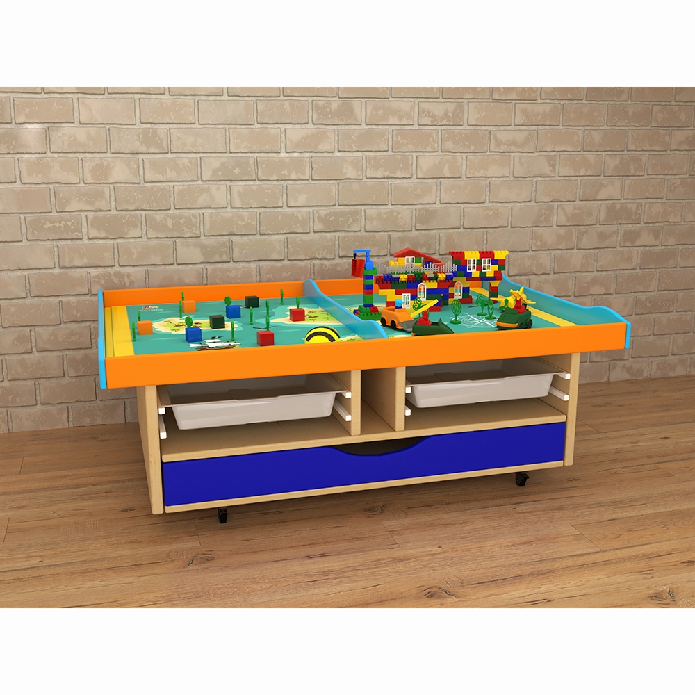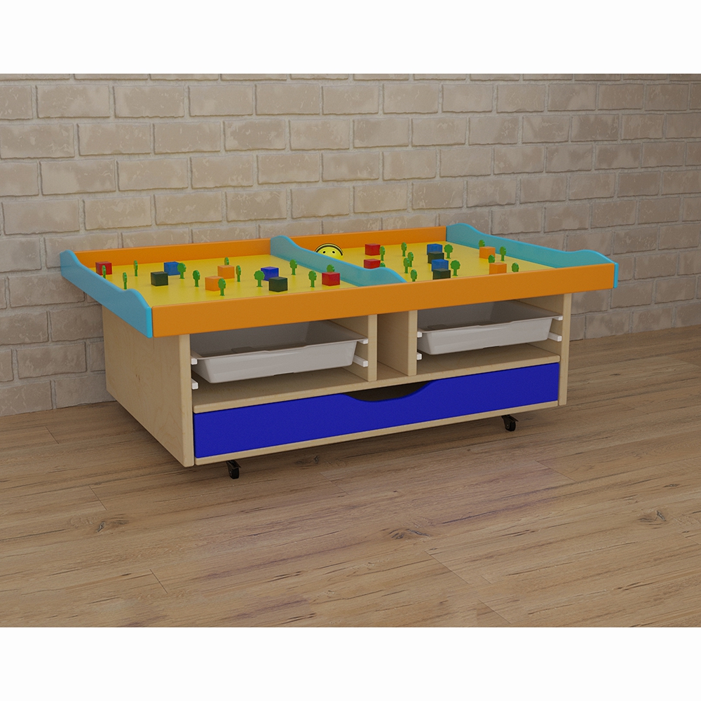 Расположенные на поверхности стола локации помогут формированию у детей картины мира и отдельных его составляющих. Локации ограничены друг от друга бортиками, это позволяет расположить одновременно на одном столе 2 совершенно разные развивающие игры. В полках стола можно хранить развивающие материалы, предназначенные для развития разнообразных навыков у детей.