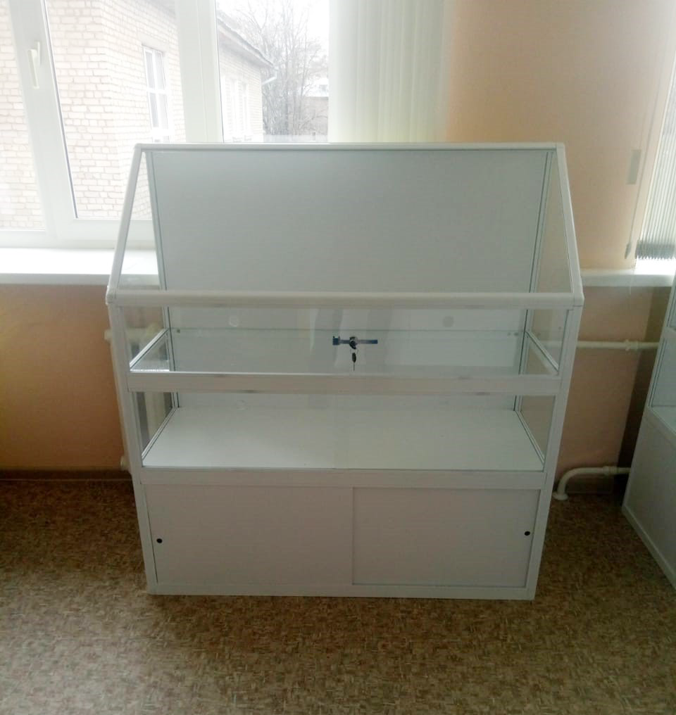 Стенд-витрина выполнен из алюминиевого профиля, полки из минерального стекла -5 мм, дверцы и боковые стенки из минерального стекла -5 мм, дверцы и боковые стенки из минерального стекла -4 мм, с бронированием пленкой 112 мкм.