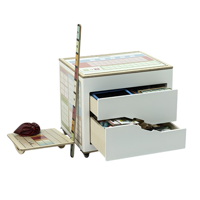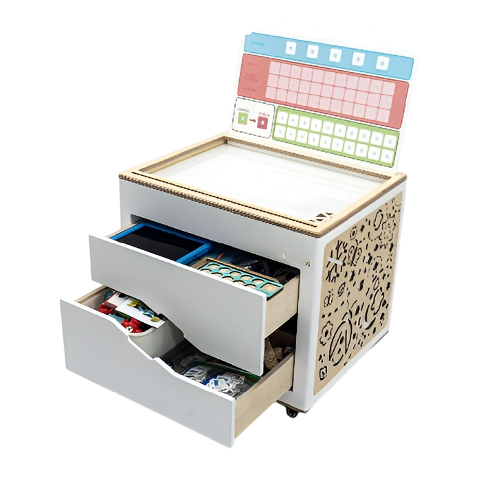Мобильный куб с выкатными ящиками плавного хода, функциональными боковинами и верхней крышкой. Его можно передвигать в любое место, где ребёнку будет удобно заниматься.