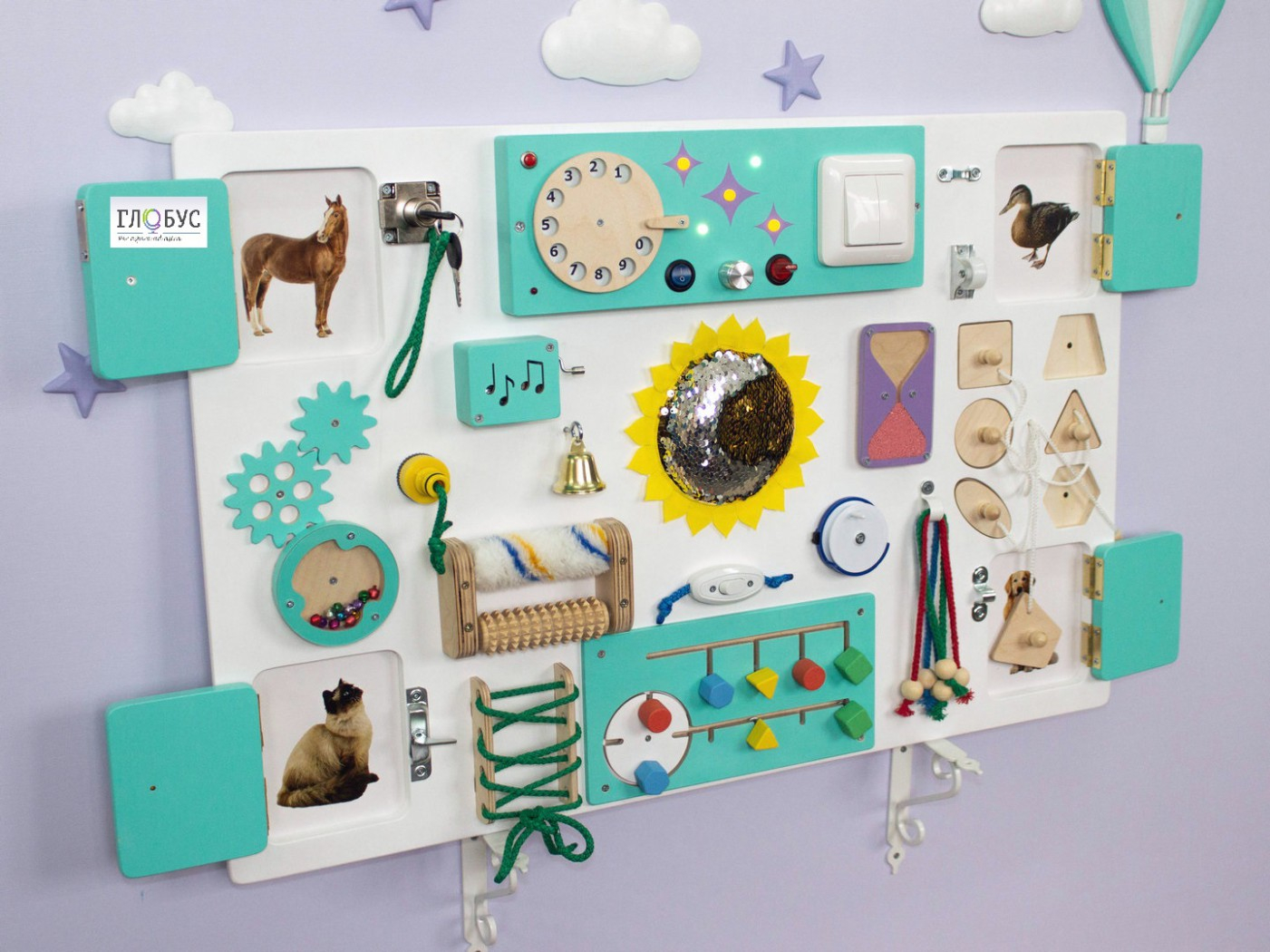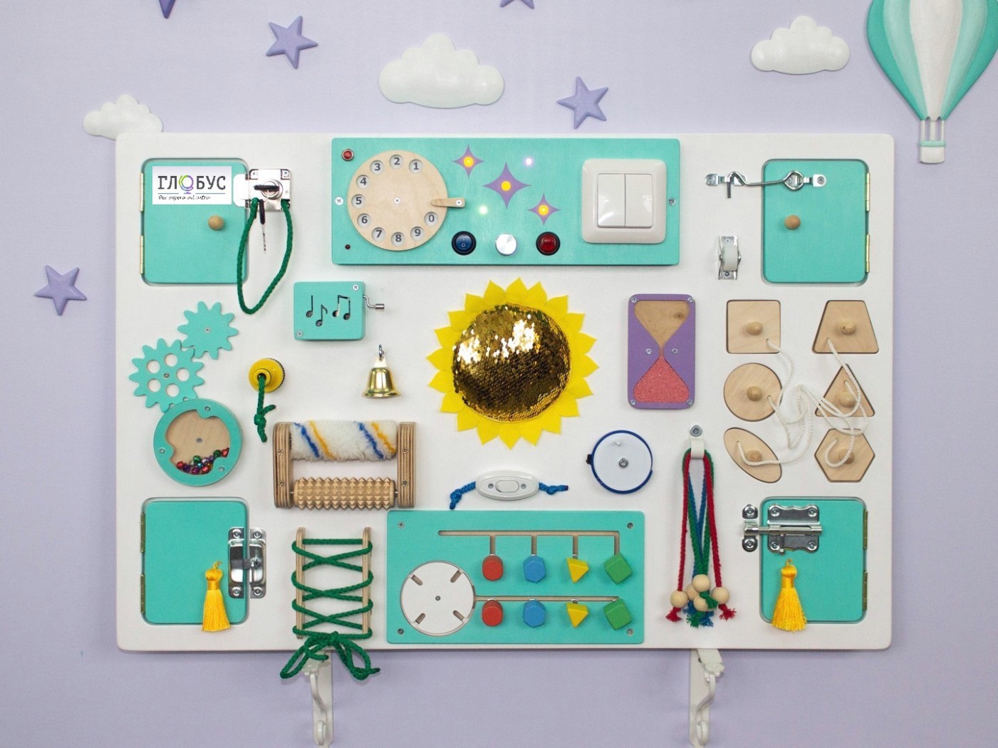 Бизиборд полностью покрашен, что позволяет делать качественную влажную уборку, исключает возможность заноз. Игрушка будет радовать вас своей красотой много лет.