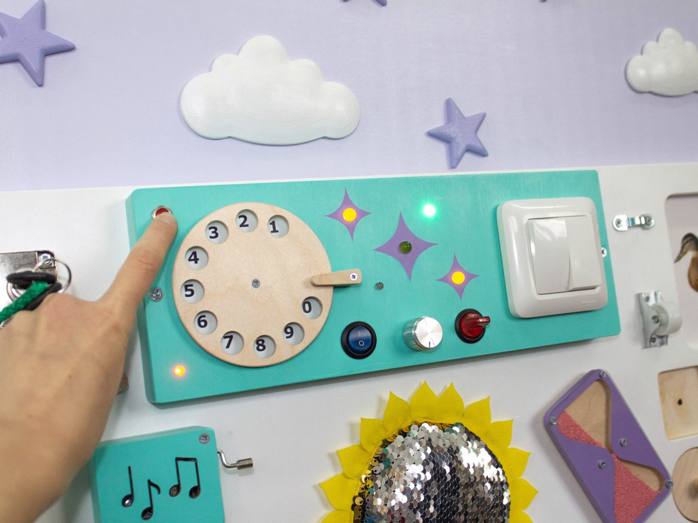 Большой бизиборд с большим количеством разных тактильных стимулов, световыми и приятными музыкальными эффектами. На доске отсутствуют съемные элементы. Различная сложность задач обеспечит длительный интерес к доске.