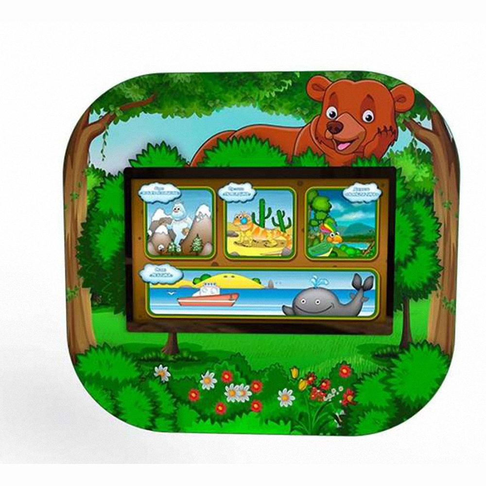 «Мишка» представлен в виде настенной панели из ламинированной ДСП со встроенным экраном. Этот монитор характеризуется диагональю 23,8”, разрешением 1920х1080 px и поддержкой до 10 одновременных касаний (Multi Touch System), что позволяет проводить как групповые занятия, так и индивидуальные.