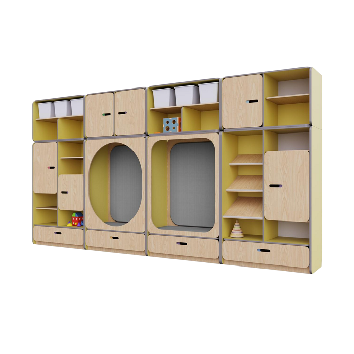 - Корпус изготовлен из экологичной березовой фанеры и ламинированной плиты. Эти материалы устойчивы к механическим воздействиям и влаге, что обеспечивает долговечность и безопасность их использования в детских учреждениях.