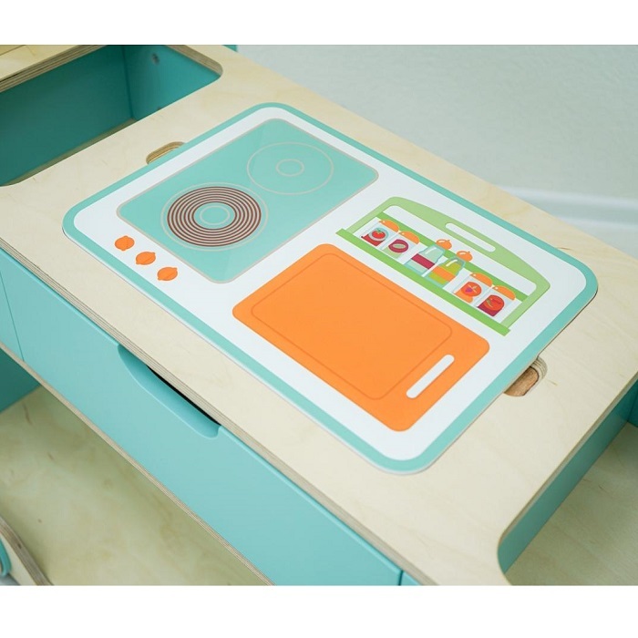 Полка-скамейка выполнена таким образом, чтобы малышам было удобно сидеть на ней, играя в «паровоз» или собирая пазлы и конструкторы.