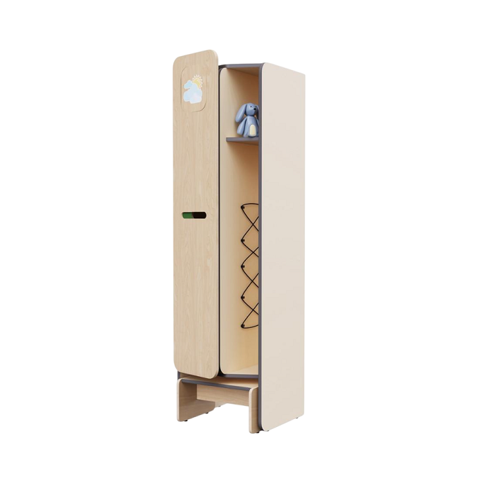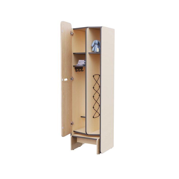 Детский шкаф-кабинка для хранения вещей и игрушек. Он разделён на две функциональные зоны: открытую - для верхней одежды, чтобы просушить её после прогулки в сырую погоду, и закрытую - для сменной одежды и обуви. Снизу шкафа идёт выдвижная скамейка. Предмет из коллекции мебели «НЕГА».