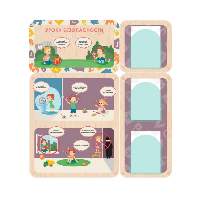 — Обучение и просвещение детей. Главная цель этих стендов - научить детей безопасному поведению в различных ситуациях. Они используют визуализацию и доступные объяснения, чтобы помочь ребёнку лучше понять и запомнить правила безопасности.