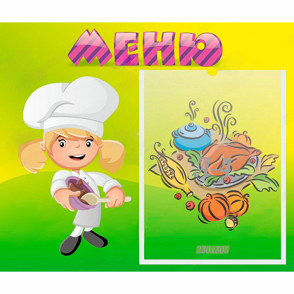 Чем сегодня кормят ребят на завтрак? Об этом вам расскажет юный Поварёнок. И о том, что повара готовят на обед и ужин он тоже знает точно, ведь Поварёнок сам принимает участие в приготовлении блюд. Стенд «Меню» имеет необычный дизайн заголовка, выполненный большими буквами в полоску. Стенд легкий, но очень прочный. Выполнен он из качественных материалов, краска не теряет своей яркости на солнце. Информационный карман прочный, рассчитанный на ежедневную замену листов. Дизайн понравиться не только детям, но и взрослым.