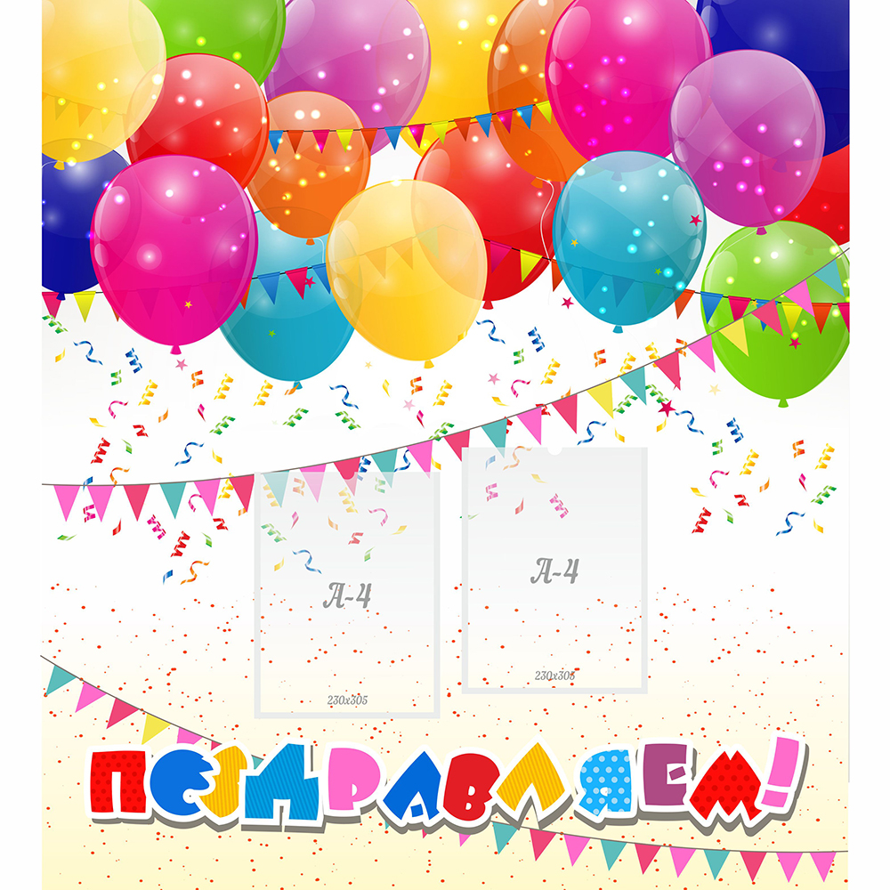 Стенд украшен изображением воздушных шаров, флажков и конфетти. С его помощью можно поздравить малышей с днем рождения или другими значимыми праздниками – 8 марта, 23 февраля, Новым годом. Для размещения имен, фотографий именинников и различных поздравительных плакатов, открыток и стихов предусмотрены удобные карманы.