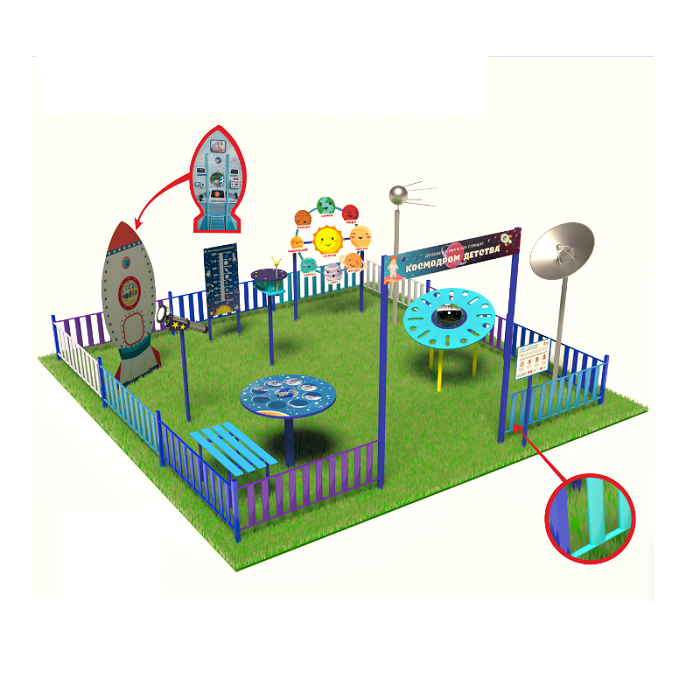 «Детская космическая станция» - это уличный комплекс, в состав которого входят красочные интерактивные стенды и макеты. С их помощью дети осваивают первые азы астрономии.