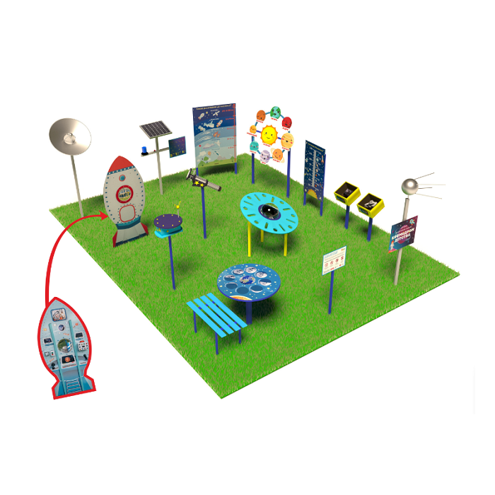 «Детская космическая станция» - это уличный комплекс, в состав которого входят красочные интерактивные стенды и макеты. С их помощью дети осваивают первые азы астрономии.