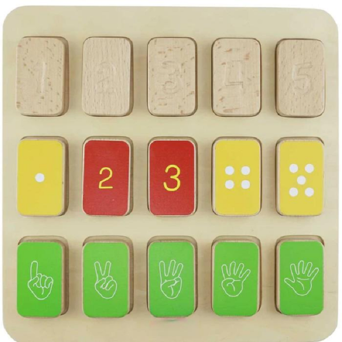 Учебная доска 1-5 с 15 плитками с числами. Числа 1-5 представлены арабскими цифрами, жестами, точками, счетными метками, выгравированными цифрами и драгоценными камнями. Дети могут изучать различные способы представления чисел за одно обучение.