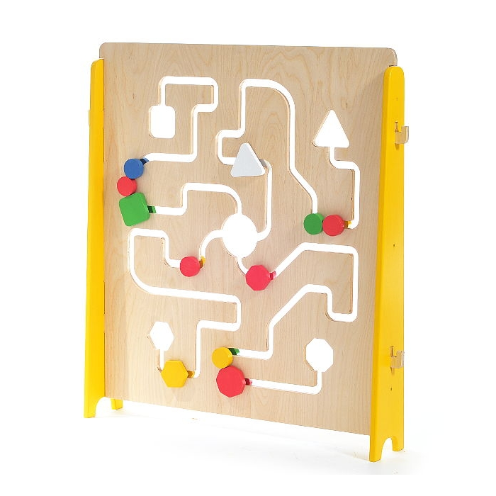 Панель игровой стены с желобом сложного рисунка, в который вставлены деревянные геометрические фигуры разных цветов.