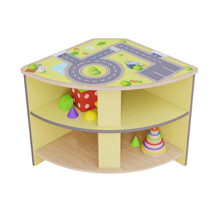 Угловое место для хранения идеально подходит для организации пространства в углах комнаты. Оно позволит эффективно использовать каждый сантиметр и обеспечит удобный доступ к материалам и игрушкам. На верхней поверхности цветная печать с картами дорог и настольной игрой, дети могут использовать ее для своих активностей.