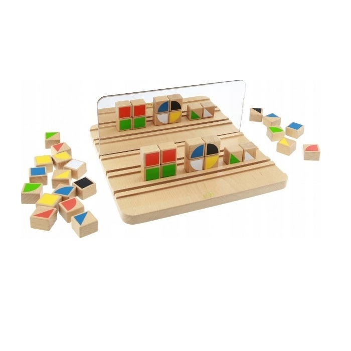 Панель выполнена из березовой фанеры, на лицевой стороне которой расположены 5 слотов, двустороннее зеркало и 30 разноцветных блоков. Панель  учит работать с зеркальным отражением.