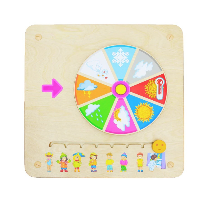 Настенная Панель выполнена из березовой фанеры, на лицевой стороне по углам подвижно закреплено колесо, разделенное на 8 сегментов с изображением различных погодных условий. Задача ребенка в зависимости от выбранных погодных условий выбрать нужную одежду, или на оборот.