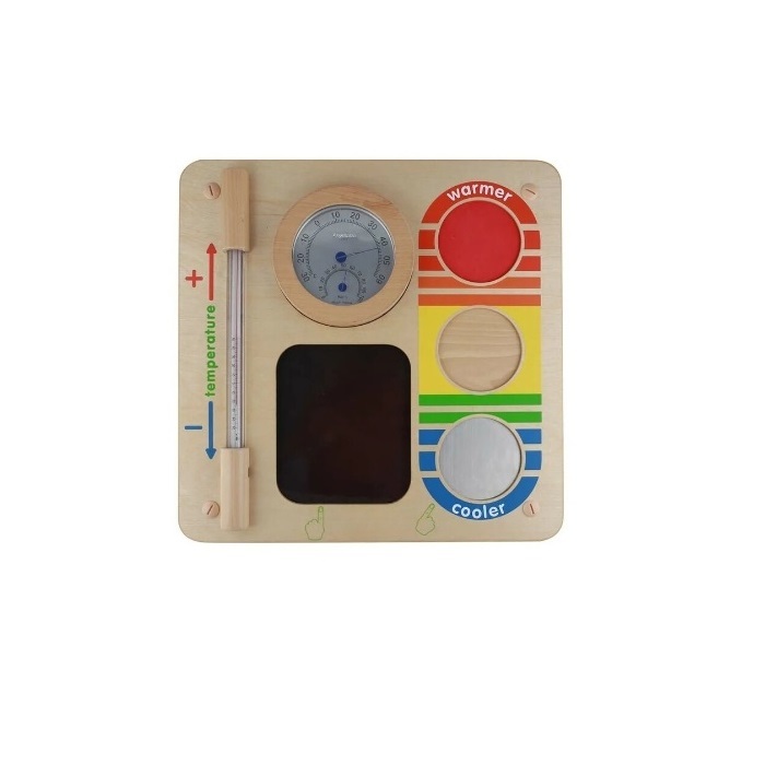 На лицевой части панели расположены большие вертикальные круглые рабочие термометры, которые дают возможность детям определить сегодняшнюю температуру, а чувствительное к нагреванию сенсорное окно меняет цвет, когда на него кладут теплые руки. Три круглых поля чувствуют тепло, прохладу и холод.