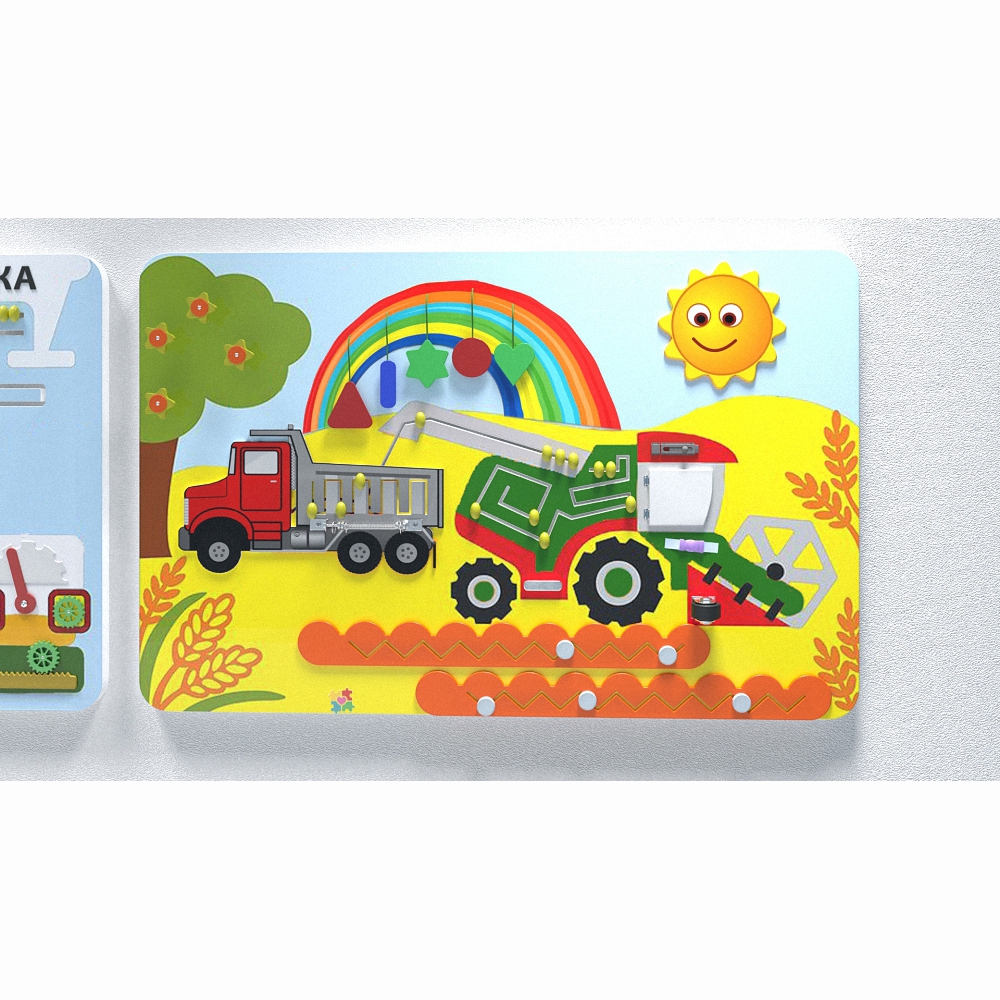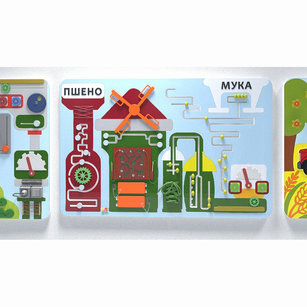 Комплект настенных панелей «Хлебокомбинат» отображает работу настоящего комбината по производству хлебопродуктов и все её этапы – от сбора урожая в поле до транспортировки готовой продукции в магазины. На панелях имеются и другие приспособления для развивающей детской игры.